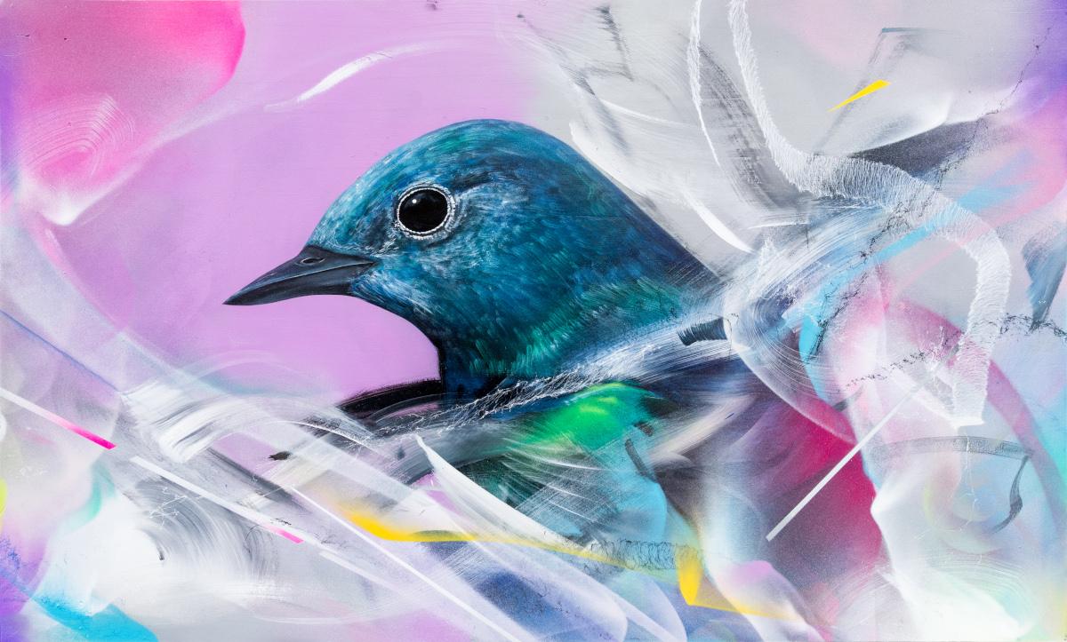 Acrylic and spray paint on board, signed on reverse