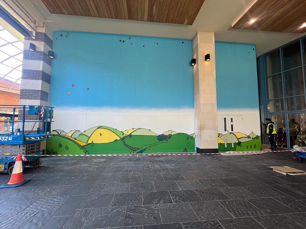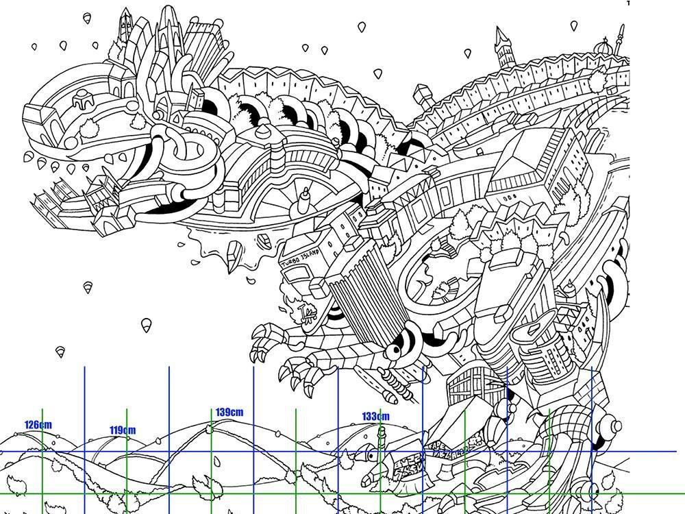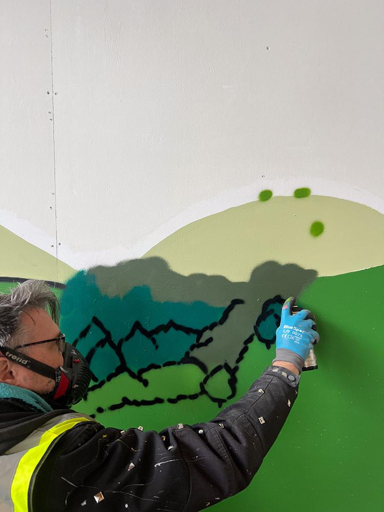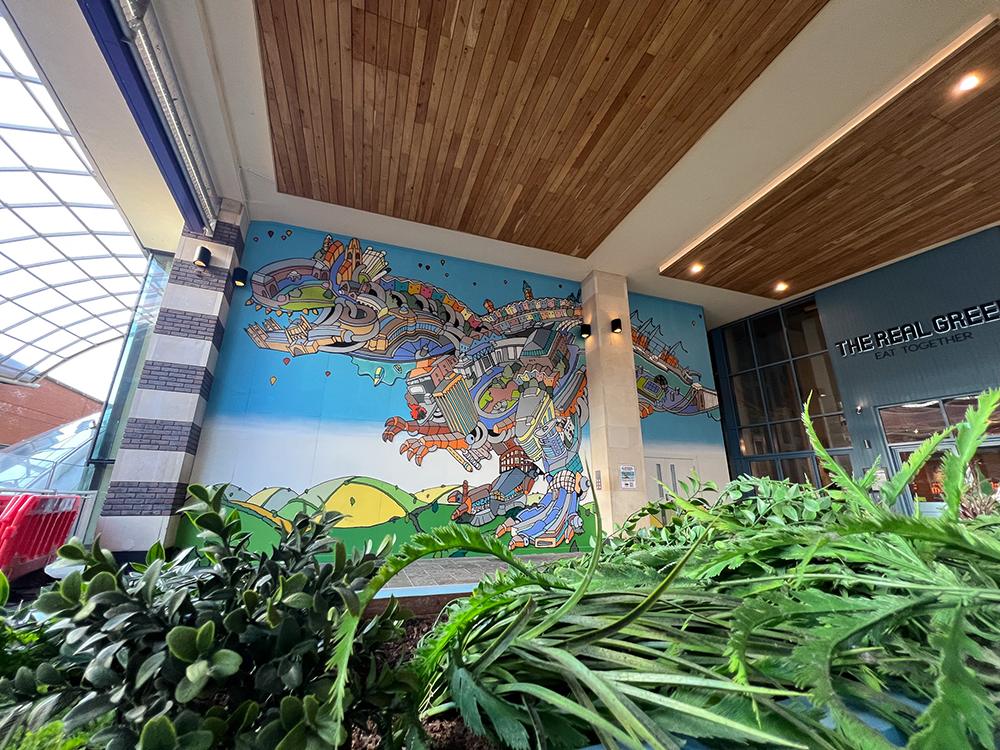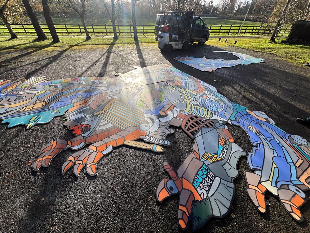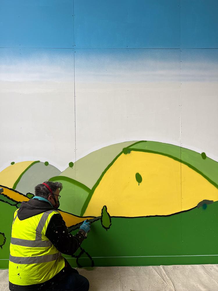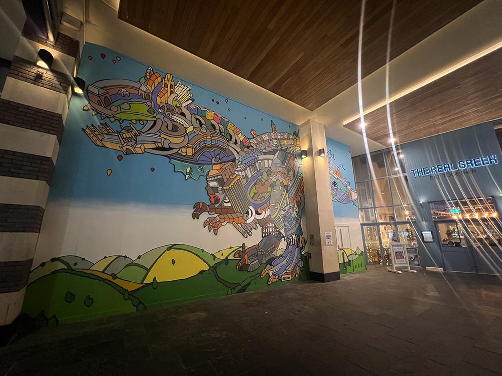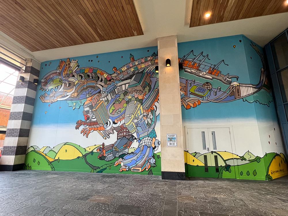 To celebrate the 20th anniversary of his Bristol Dino, Andy Council took on the challenge of creating a 60 sq meter mural/cut out of his iconic work. Unveiled in late 2024 at the entrance of the old Showcase Cinema the massive T-Rex made up of Bristol landmarks really brightened the area after the closure of the former cinema. Painted mostly at the Upfest warehouse the dino was cut out and installed by the Upfest team with Andy completing the mural with an in situ background for the dino to roam in.