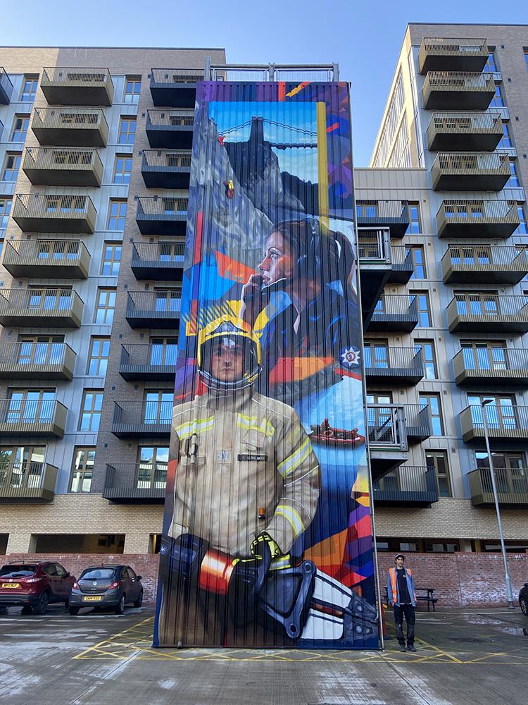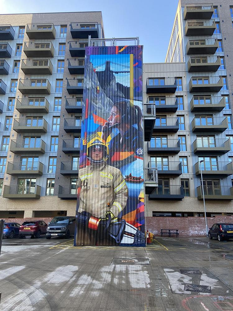 Redcliffe & Temple BID funded a mural in the heart of Bristol on a rather unusual canvas, the Avon Fire & Rescue training tower. With the vision to develop Redcliffe & Temple into a vibrant, thriving, sustainable, safe and welcoming place to enjoy Upfest were brought in to find an artist that could fit the brief set. ‘Not just fires’ Avon Fire & Rescue wanted to show all aspects of the service including rope rescue, water rescue, road traffic collisions and control centres. The mural, painted by Hasan Kamil, featured real people who work for Avon Fire & Rescue and really brought the brief to life on the 10m tall wall.
