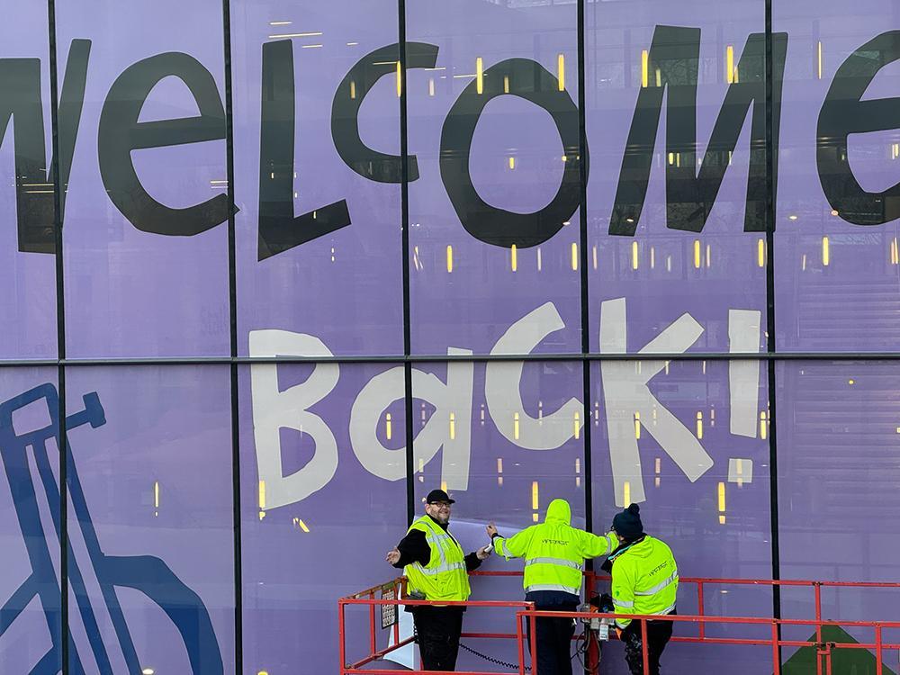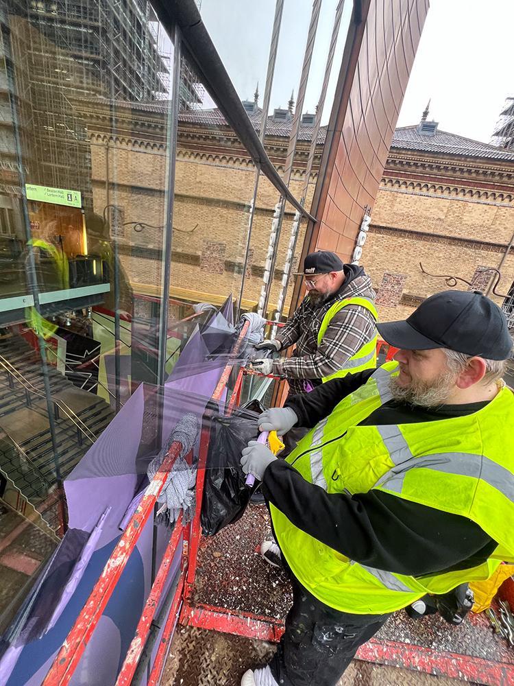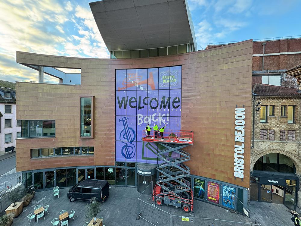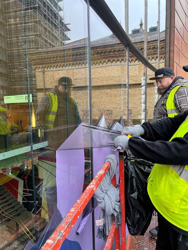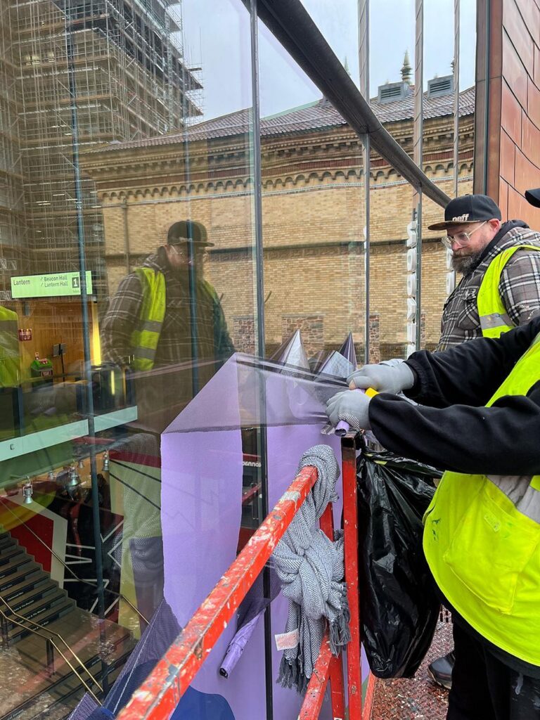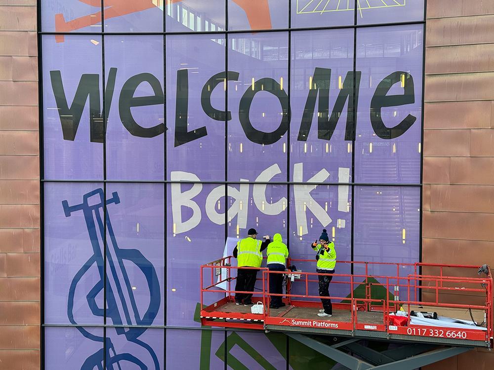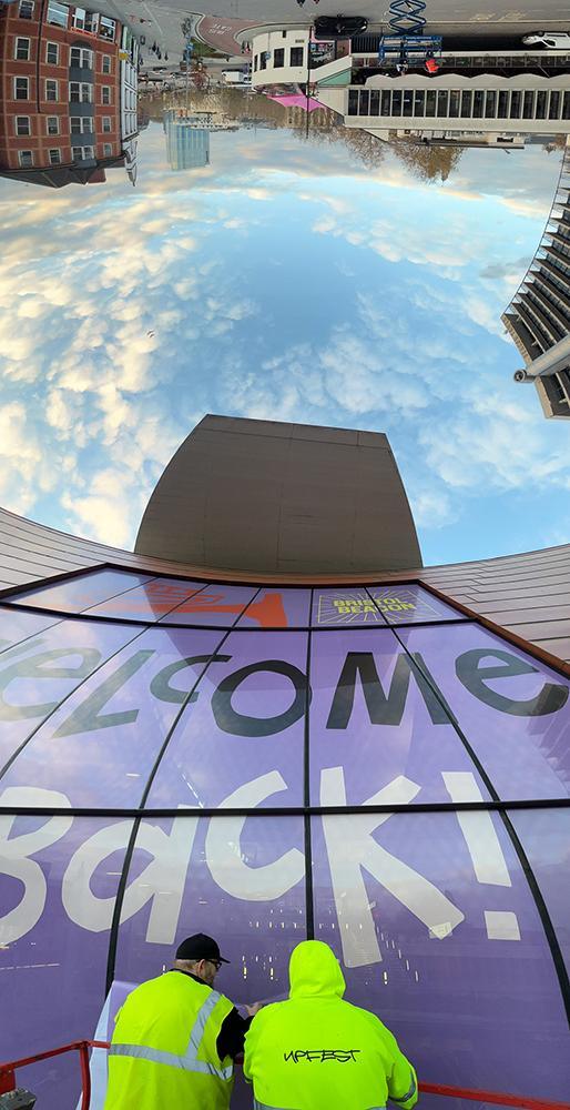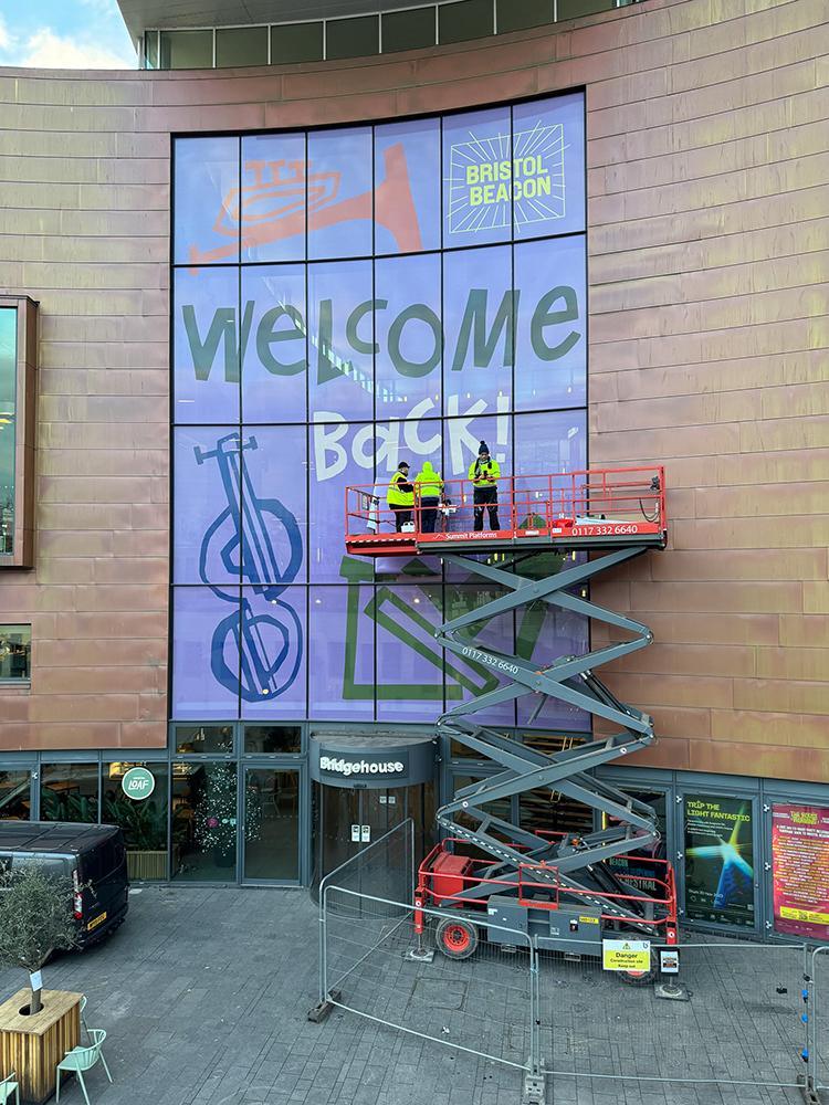 Upfest have been involved with the reopening of the Bristol Beacon with the logistics and installation of their giant window decals. Using their knowledge and skill from years of experience Upfest crew members installed decals across the 24 large windows that welcome you to the Bristol Beacon entrance.