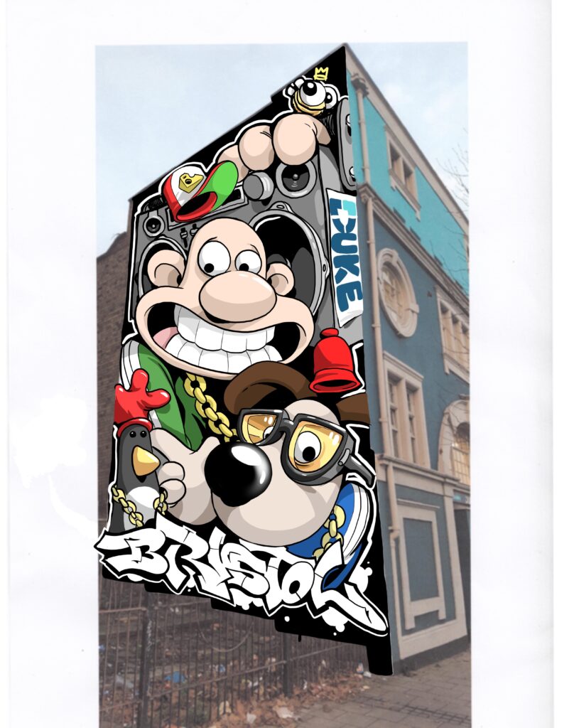 Working in collaboration with Yuzu creative this amazing piece based on the much loved Bristol icons of Aardmans, Wallace and Gromit. Painted by Cheo and Soker