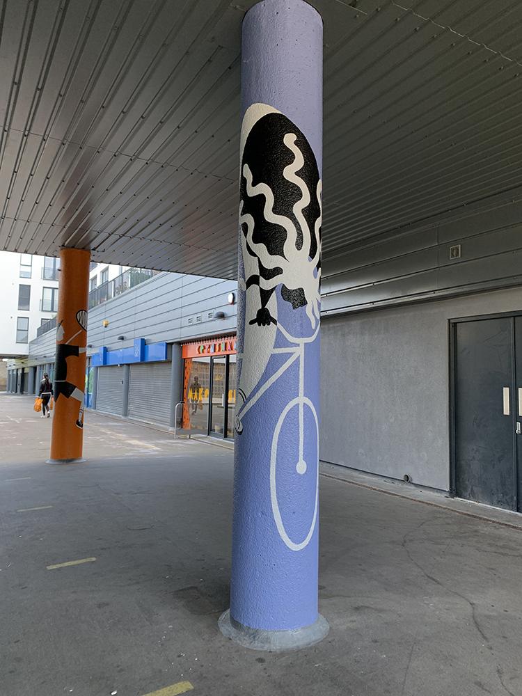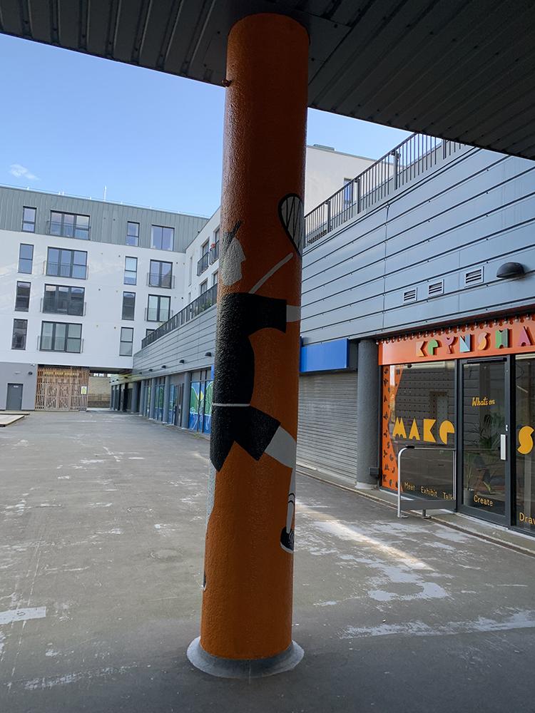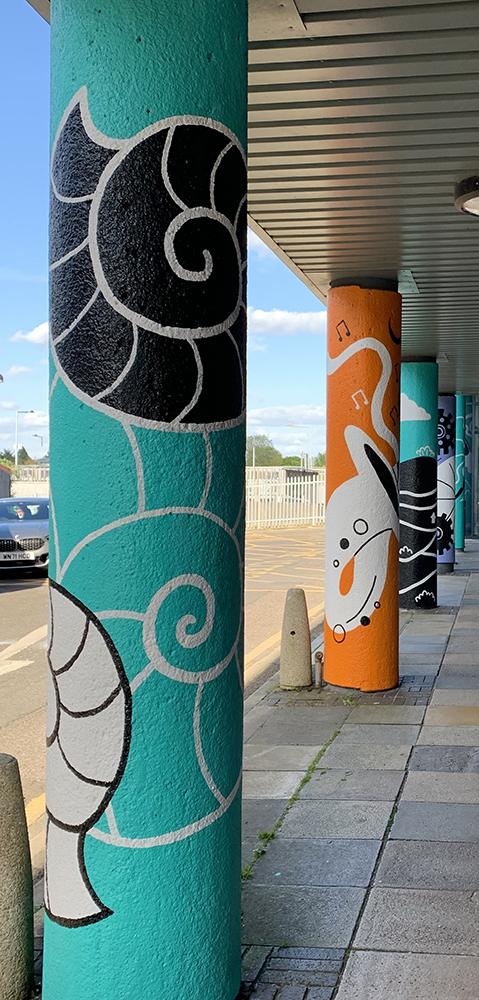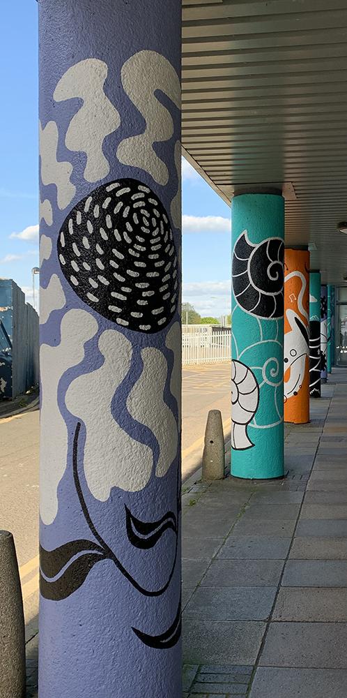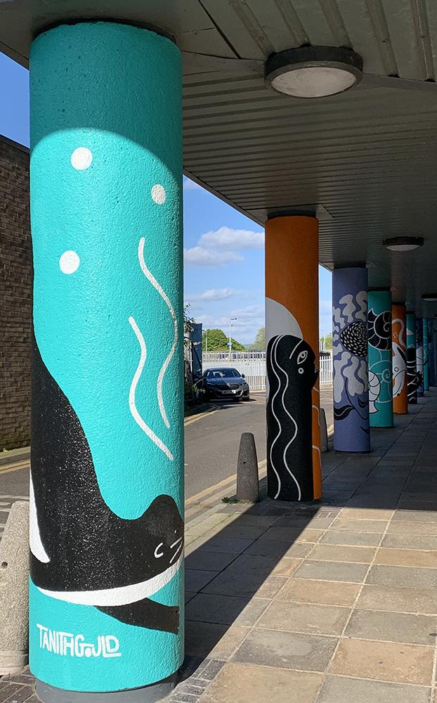 Bath & North East Somerset Council approached Upfest to enliven a dull grey walkway leading from Keynsham High Street to independent shops and the main gym of the town. Tanith Gould took on the commission and with careful consideration brought to life the pillars with nods to all aspects of Keynsham’s history, culture, heritage and wildlife.