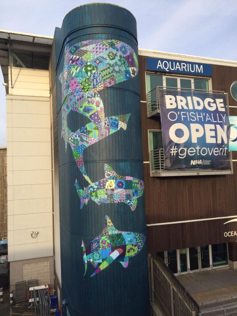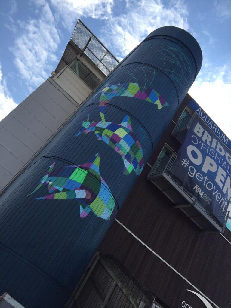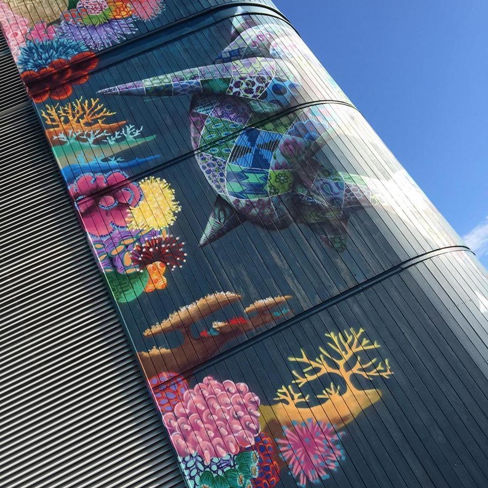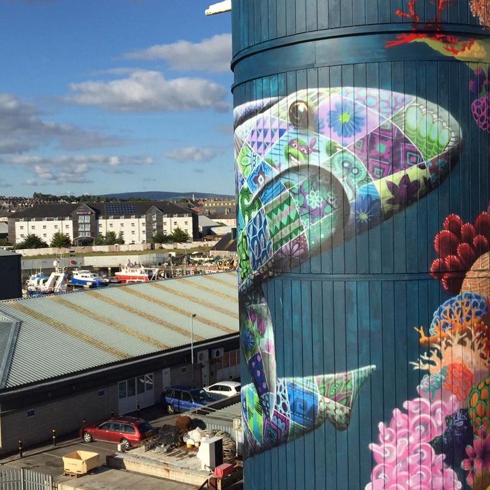 To conincide with World Ocean Day Upfest were commissioned to create a new mural on the side of National Marine Aquarium, Plymouth. Louis Masai worked on the mural to highlight the vulnerable status of the Basking Shark.