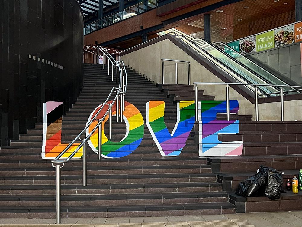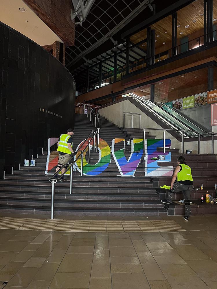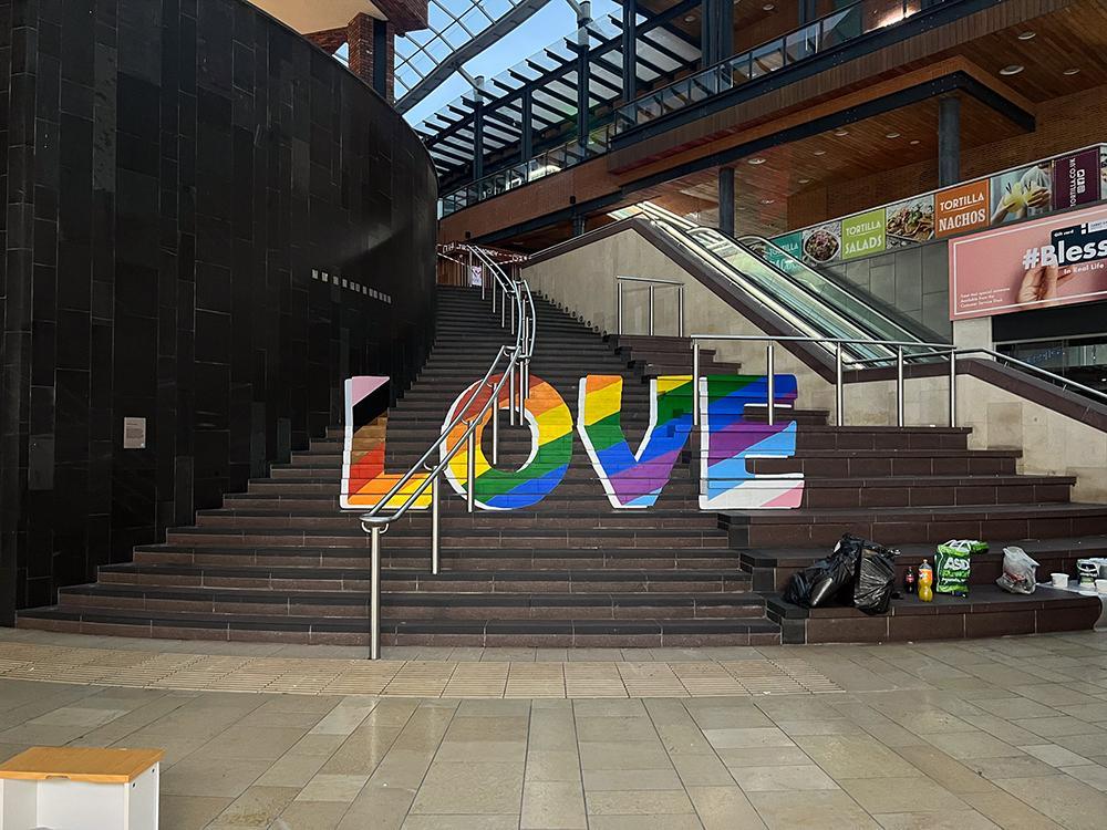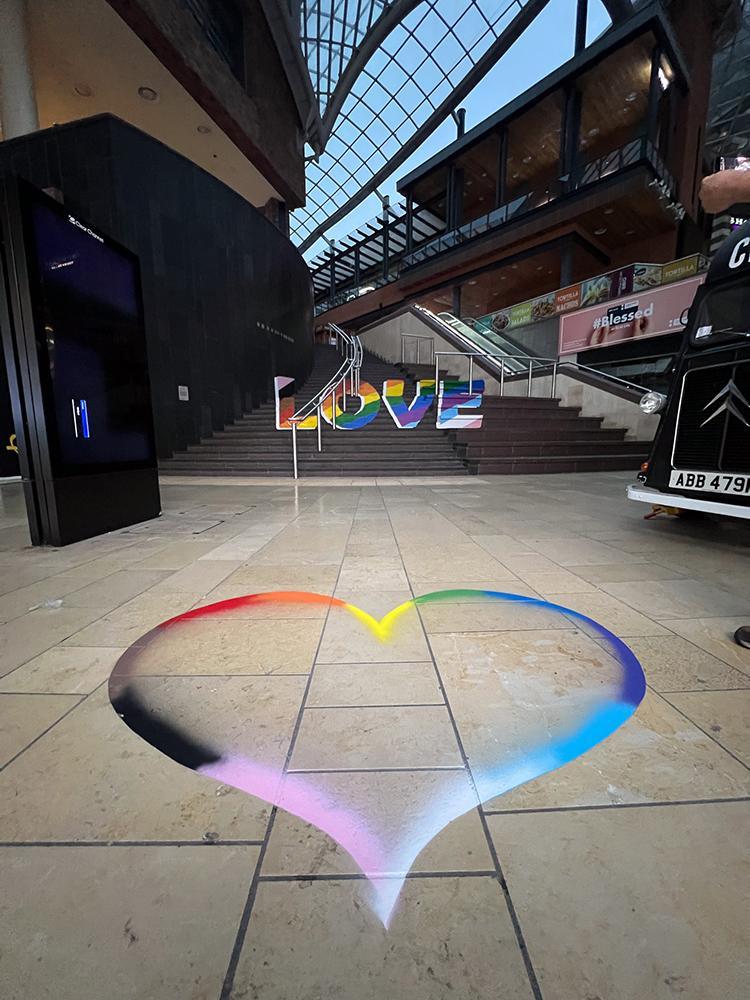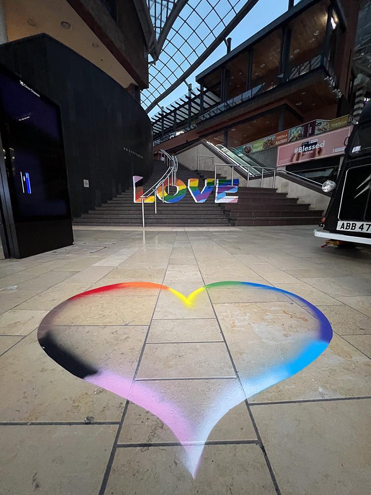 Upfest initiated different activations to celebrate pride month at Cabot Circus including optical illusion rainbow love steps and rainbow love hearts.
