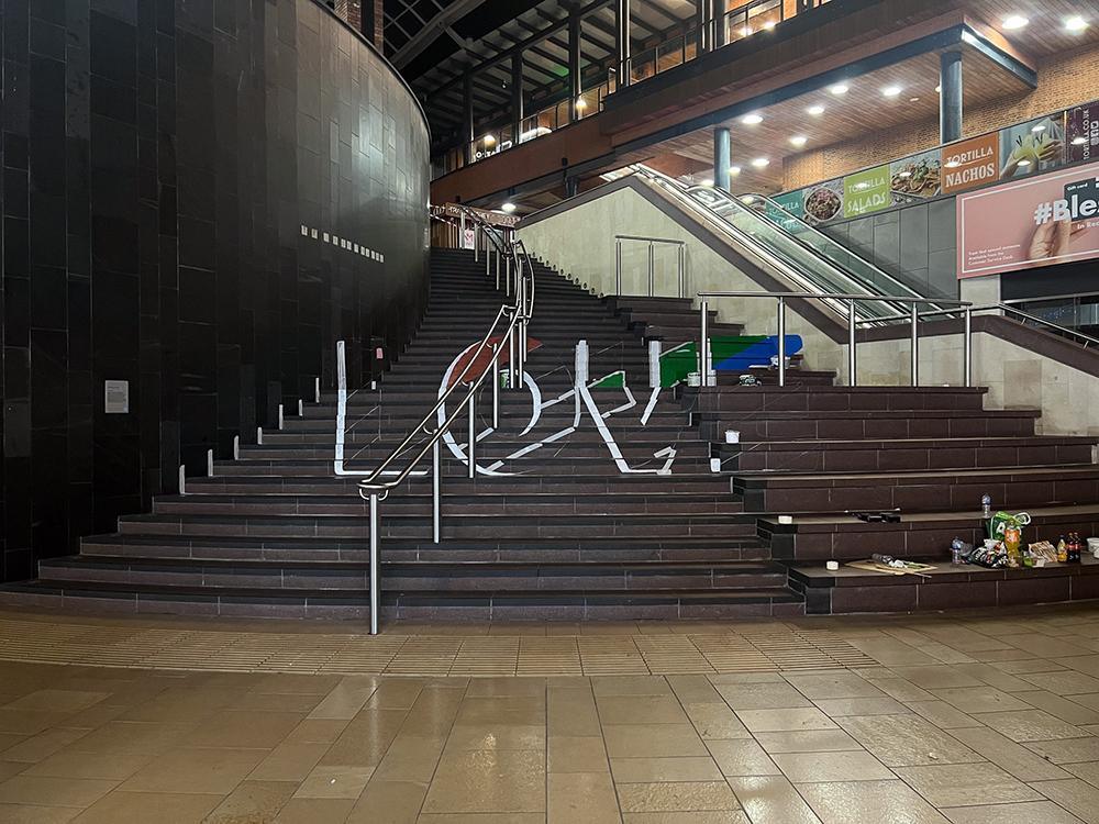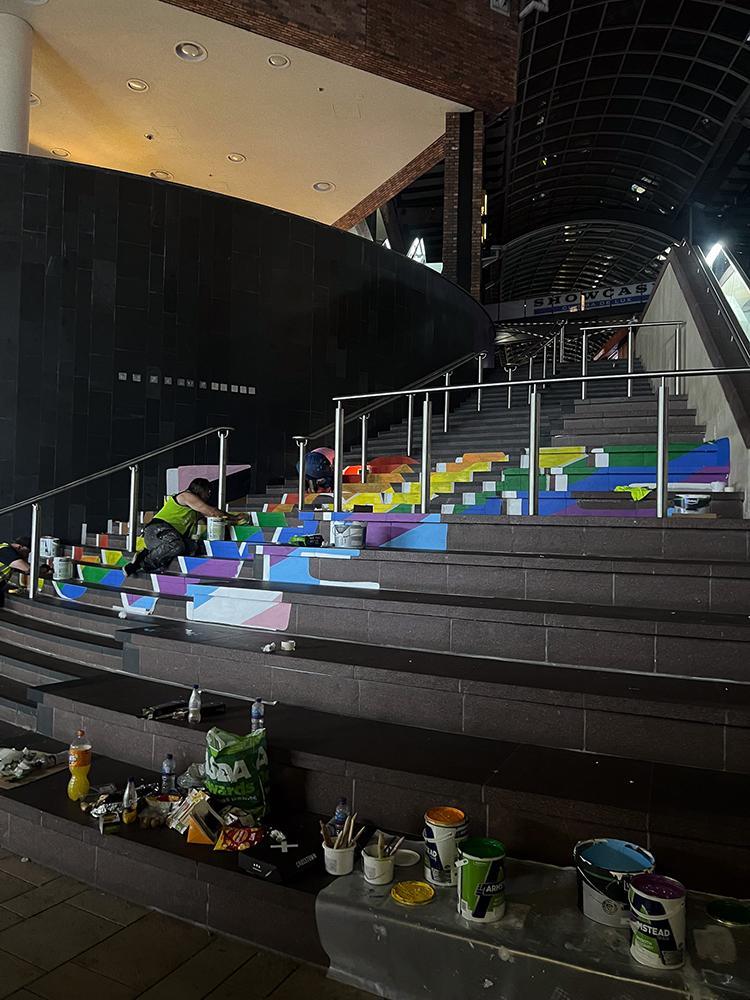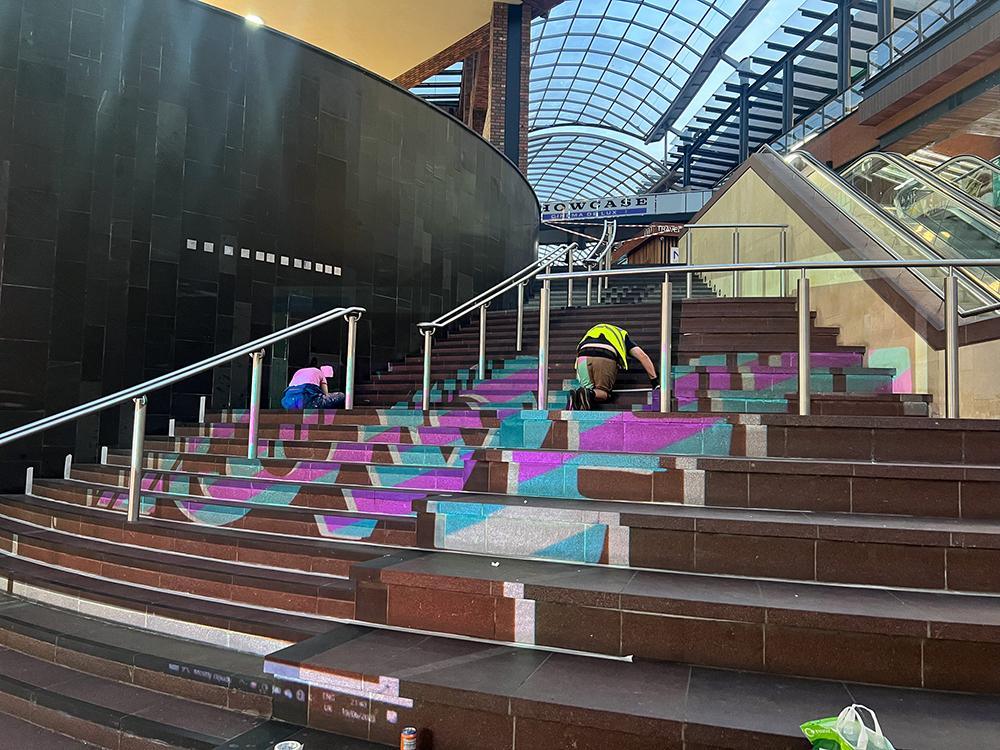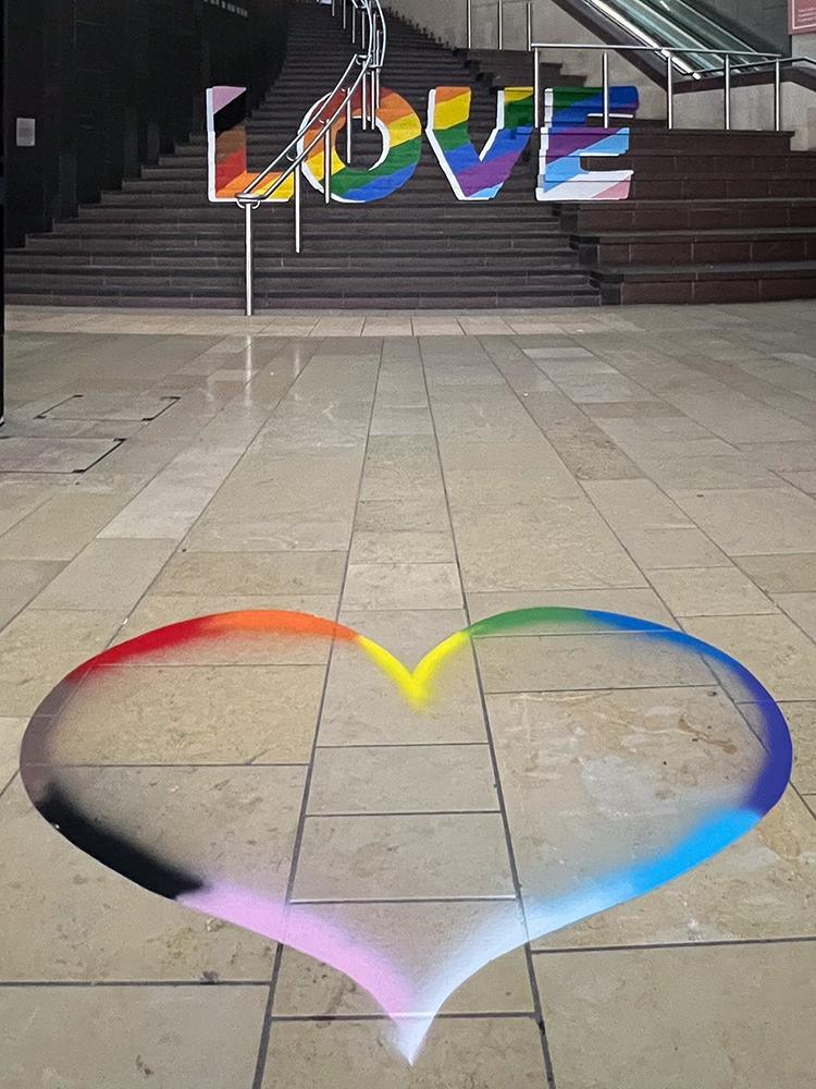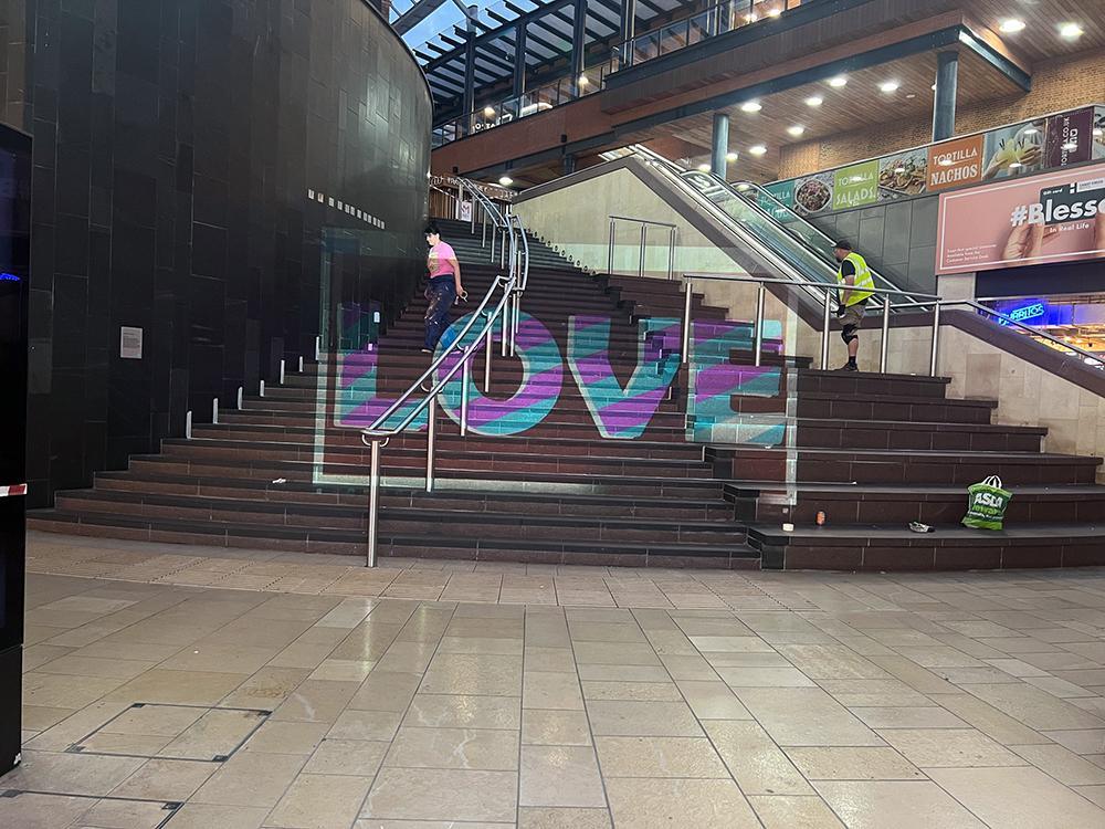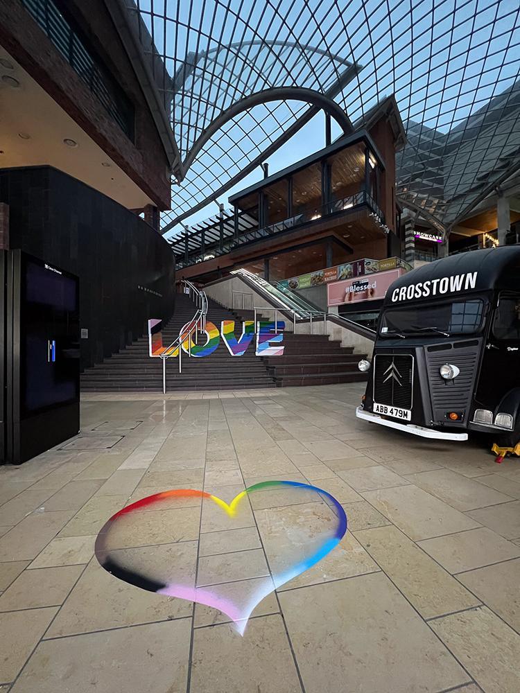Upfest initiated different activations to celebrate pride month at Cabot Circus including optical illusion rainbow love steps and rainbow love hearts.